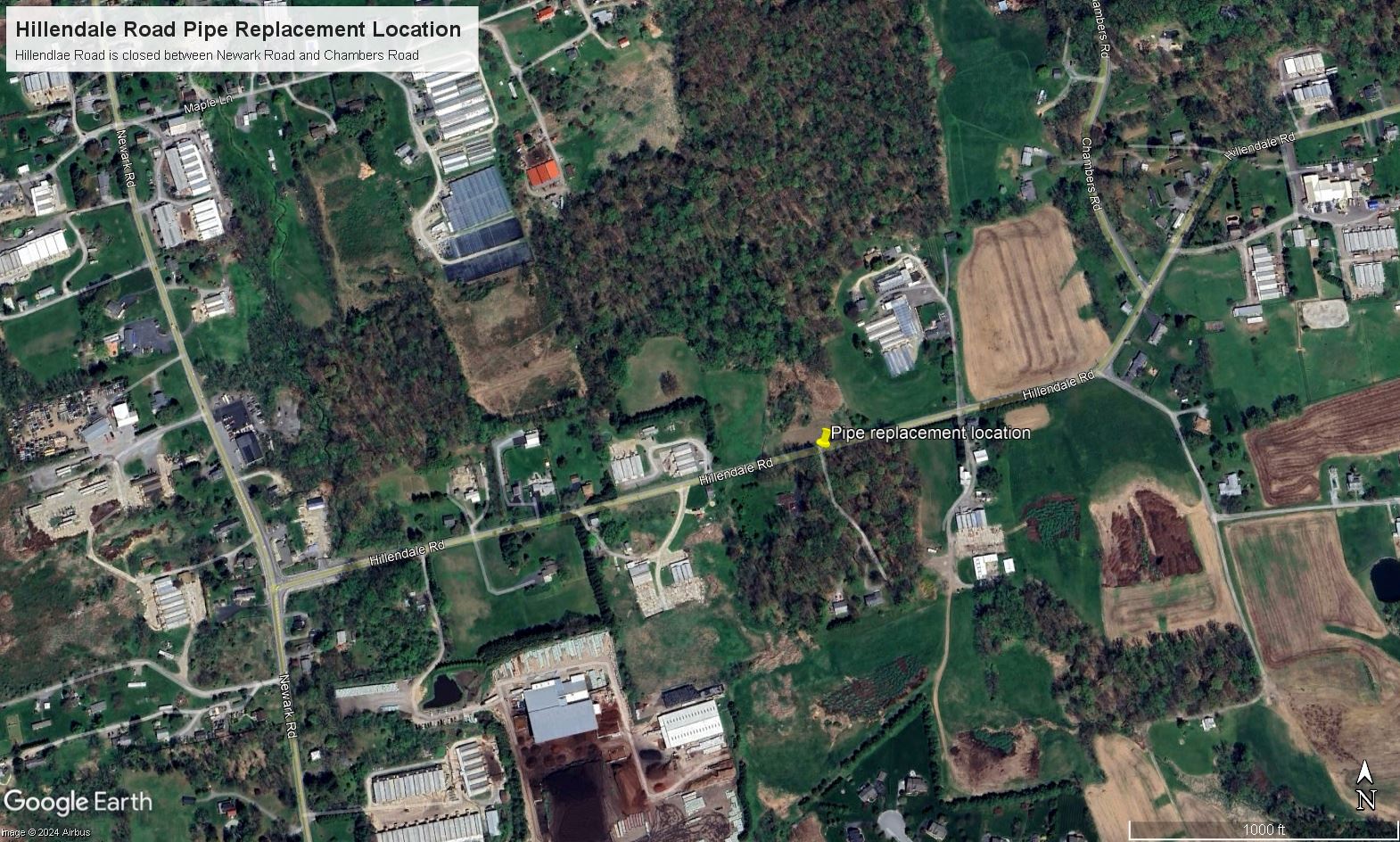 The Public Works Department will be replacing a pipe on Hillendale Road today. As a result starting at 7:30AM, Hillendale Road will be closed to through traffic from Newark Road to Chambers Road.