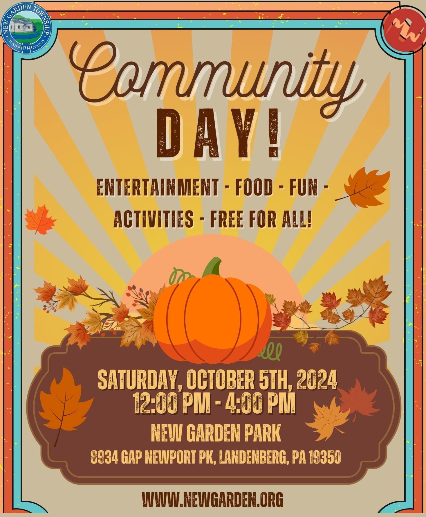 Don't forget to join us tomorrow, Saturday, October 5th, 2024, from 12:00 to 4:00 p.m. at New Garden Park for our annual Community Day event! We have SO many activities planned for everyone to enjoy. We hope to see you there!