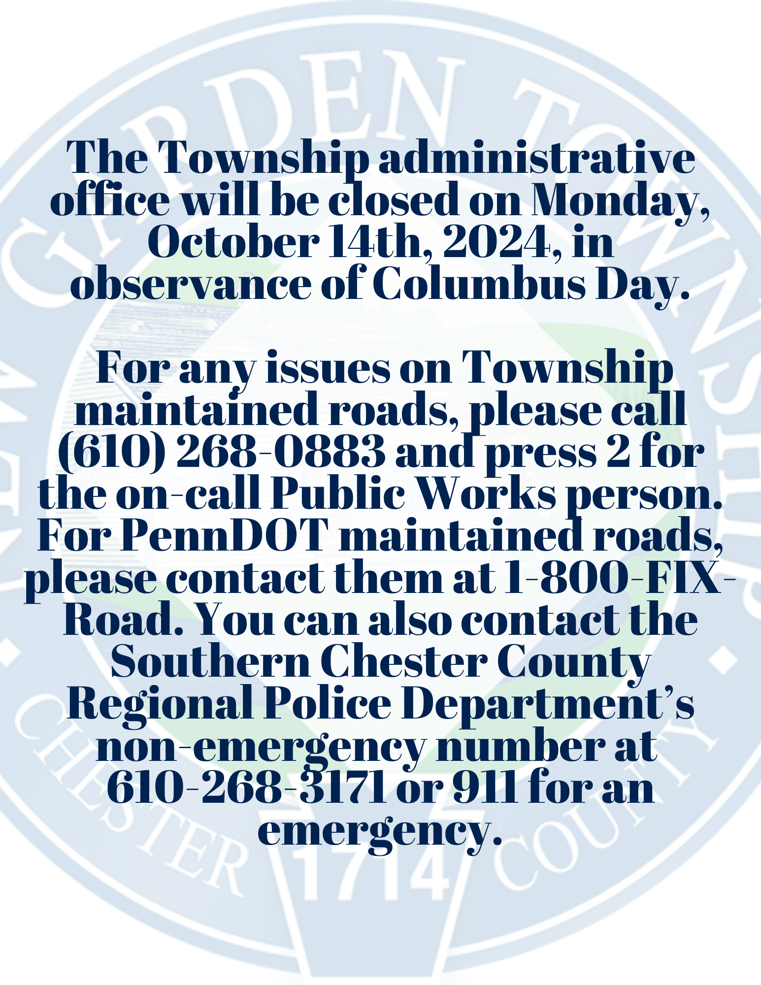 The Township administrative office will be closed on Monday, October 14th, 2024, in observance of Columbus Day.