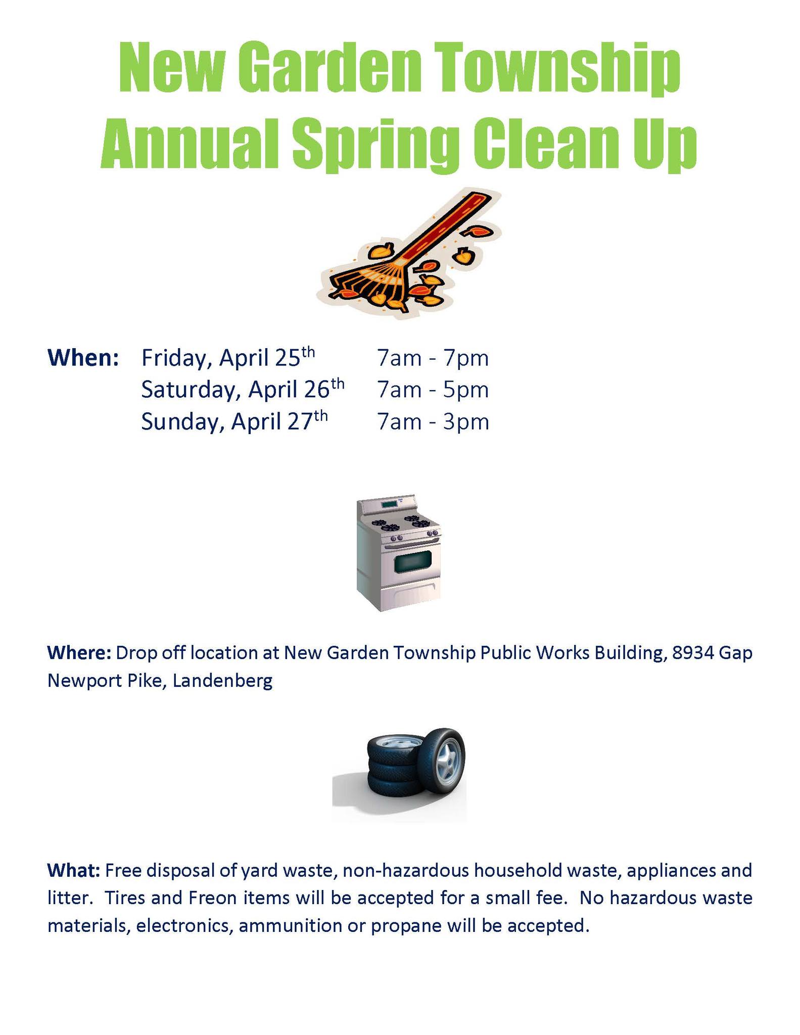 The annual Spring Clean-Up event begins tomorrow, Friday, April 25th, 2024. This is a free event for residents of New Garden Township, Chester County, PA!